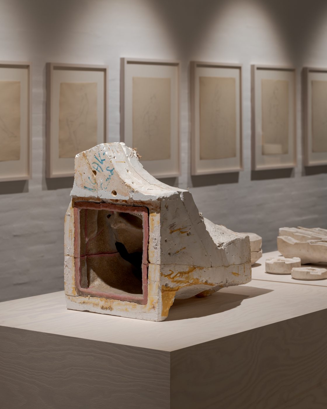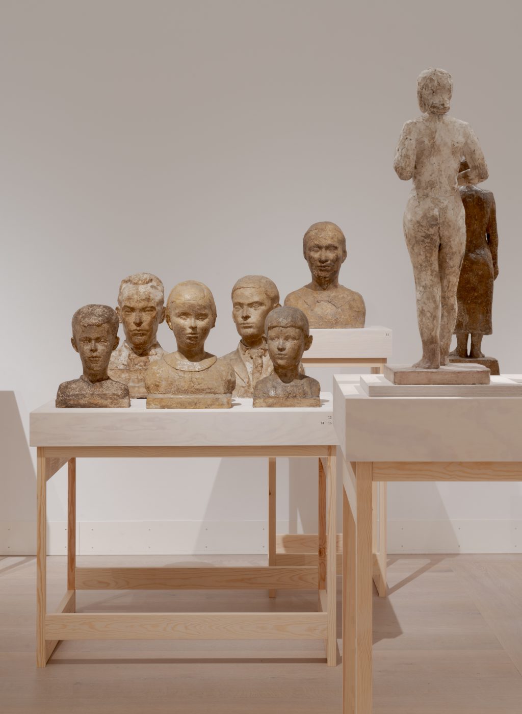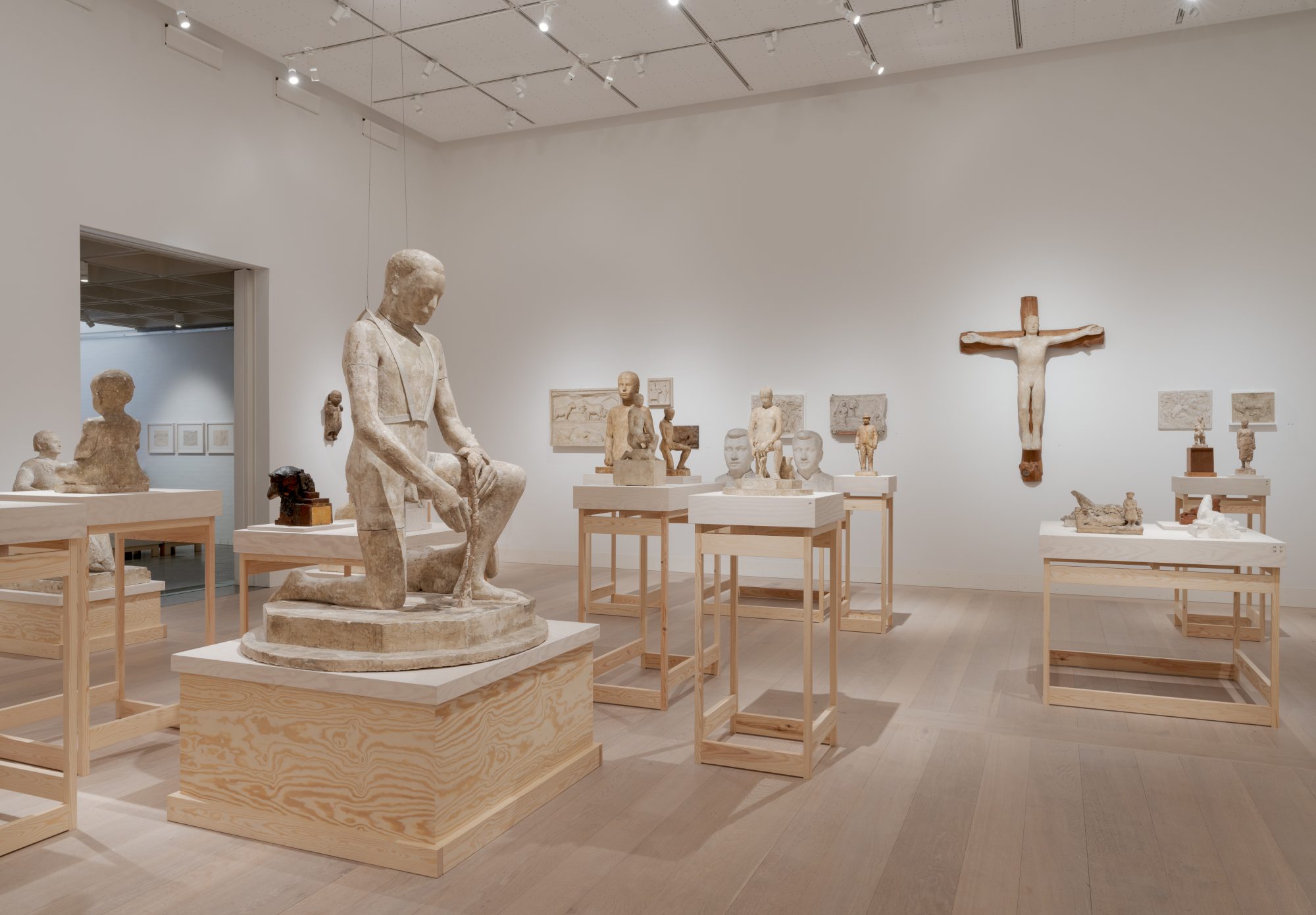 The design explores the role of the plinth, drawing inspiration from Noack’s own modelling stands and studio armatures. A series of timber-frame podiums reinterpret these structural geometries, creating a quiet and supportive backdrop. The use of pine introduces a subtle material contrast to the predominantly white plaster sculptures.